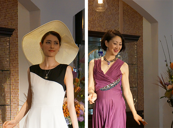続いてモデル・松宮りえが、夕陽を映したかのような、赤やオレンジの遊色効果のブラックオパールの「アドリア海の夕陽」を着けて登場すると会場からはため息が。